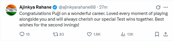 वहीं, उनके संन्यास लेने के बाद क्रिकेट के दिग्गजों ने उन्हें याद करते हुए पोस्ट लिखा है। जंबो यानी अनिल कुंबले ने लिखा है कि शानदार करियर के लिए बधाई! आप इस शानदार खेल के बेहतरीन दूत रहे हैं @cheteshwar1 । हम सभी को आपके क्रिकेट मैदान पर किए गए उपलब्धियों पर गर्व है। आपने हमेशा टीम के लिए अपना सब कुछ झोंक दिया! आपके साथ काम करना एक सौभाग्य था और आशा है कि आप अपने दूसरे पारी में भी इसी तरह चमकते रहें। आप, पूजा, अदिति और आपके पिताजी को ढेरों शुभकामनाएं। बहुत अच्छा किया!!