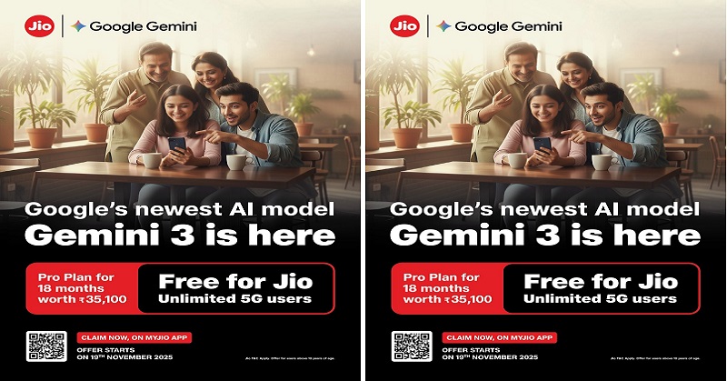 कंपनी ने बताया कि सभी जियो अनलिमिटेड 5G ग्राहक 18 महीनों तक Gemini Pro Plan का मुफ्त लाभ उठा सकेंगे, जिसकी कीमत ₹35,100 है। यह सुविधा 19 नवंबर 2025 से सभी को उपलब्ध होगी और MyJio ऐप में “Claim Now” बैनर पर क्लिक करते ही तुरंत एक्टिवेट हो जाएगी।